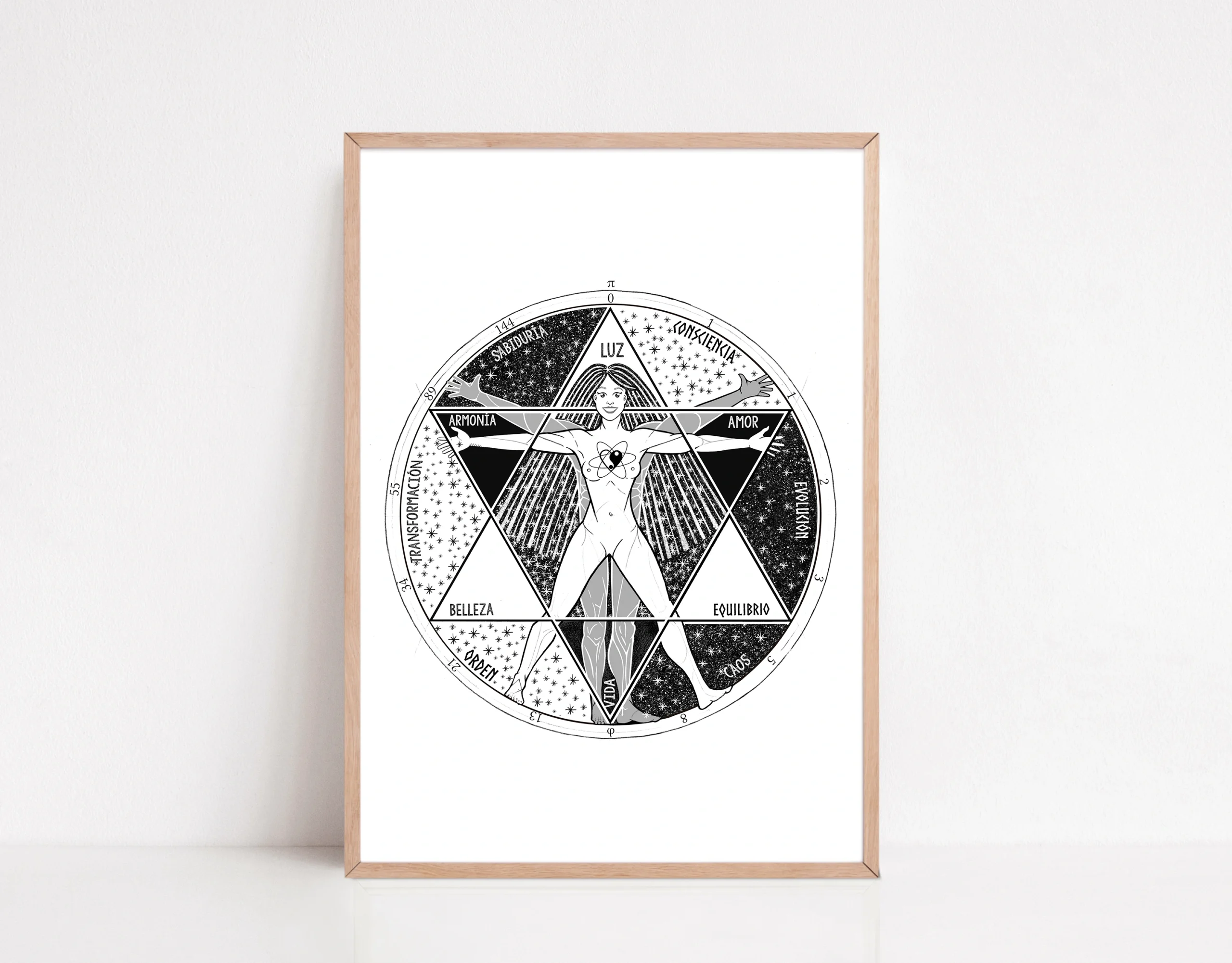 En este diagrama, inspirado en el hombre de Vitruvio de Da Vinci, encontramos el femenino contenido en el masculino y viceversa. La parte inferior es igual a la superior, y la suma de los triángulos es 12. Estos 12 triángulos nacen de los dos primeros, utilizando las fórmulas del cuadrado y el círculo. Los símbolos sagrados de la Merkaba, la cruz, la estrella de David, el teorema de Pitágoras y la flor de la vida se explican através de este equilibrio de la parte femenina y la armonía de la parte masculina. Da como resultado la belleza de la luz en la vida, atravesada por el amor, situado en el centro de la imagen mediante el corazón, el átomo y el yin y el yan en plena danza.